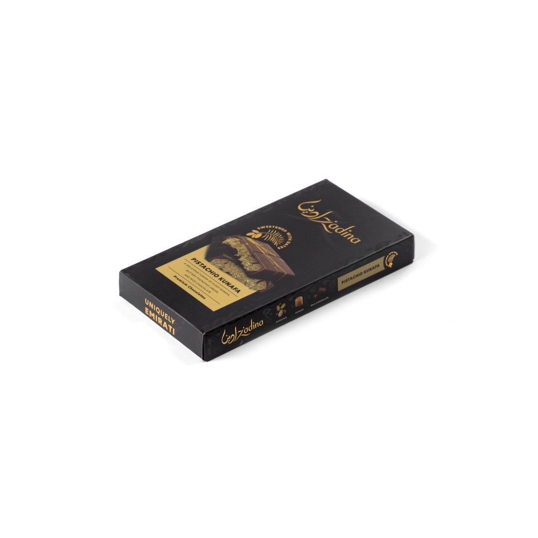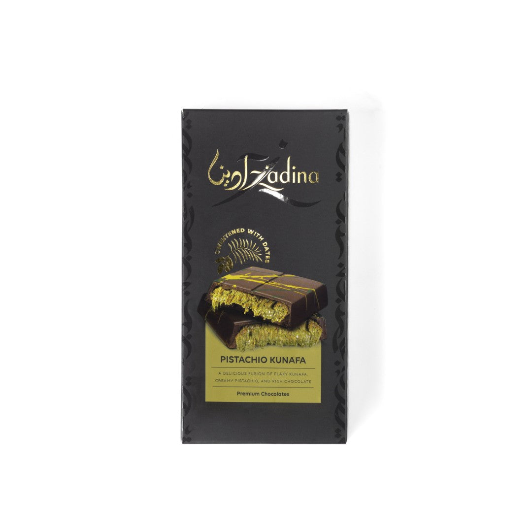 Introducing Zadina’s pistachio cream kunafa chocolate bar—our thoughtful and wholesome twist on the viral Dubai chocolate that has captivated the world. We’ve crafted this luxurious 195g bar for those who seek incredible flavor without compromising on wellness. At the heart of this kunafa chocolate bar lies rich pistachio cream, made from the finest roasted pistachios to deliver an intensely nutty and authentic taste that truly shines. Mixed with it is delicate, golden-toasted kunafa, offering a satisfying crunch for a perfect textural symphony. Zadina’s version of the Dubai chocolate bar is then enrobed in smooth, fine chocolate that is free of refined sugars and naturally sweetened with dates, allowing you to indulge all your senses guilt-free. This is more than just a trending treat; it's a celebration of handpicked ingredients, proving you can enjoy the viral kunafa chocolate bar without any health concerns.