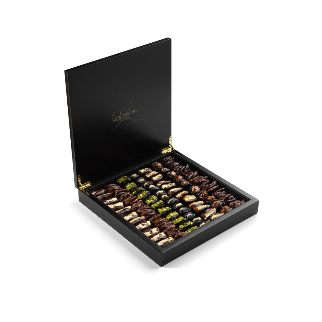 A large wooden box depicting Abu Dhabi's skyline, Zadina's Large Wooden Stuffed Dates Box is filled with a luxurious assortment of gourmet dates, celebrating the rich cultural heritage and culinary artistry of the Emirates.